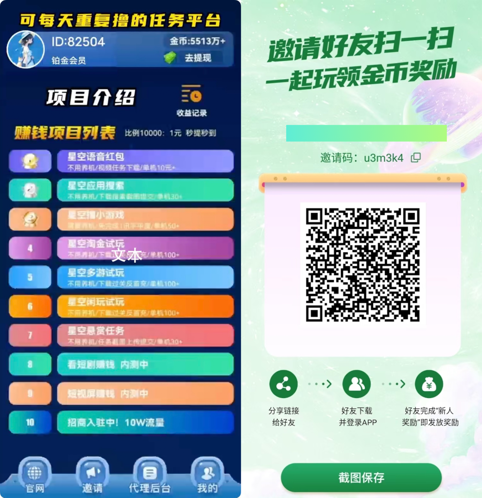 星空APP是一个集各类APP应用市场下载冲量任务(非拉新,每天可重复),看广告红包,游戏试玩,悬赏任务等多种赚钱项目的综合平台。 完全免费,人人可做,单机日入100+,安卓应用市场app下载冲量任务,可每日重复做。特别提醒:每天上午9点开始上任务,下午任务量最大。晚上任务会基本被做完,任务较少。节后将会有大量任务板块上线。养鸡技巧:在试玩游戏板块下载一个传奇类游戏挂机一晚上,第二天会有大量大额红包。